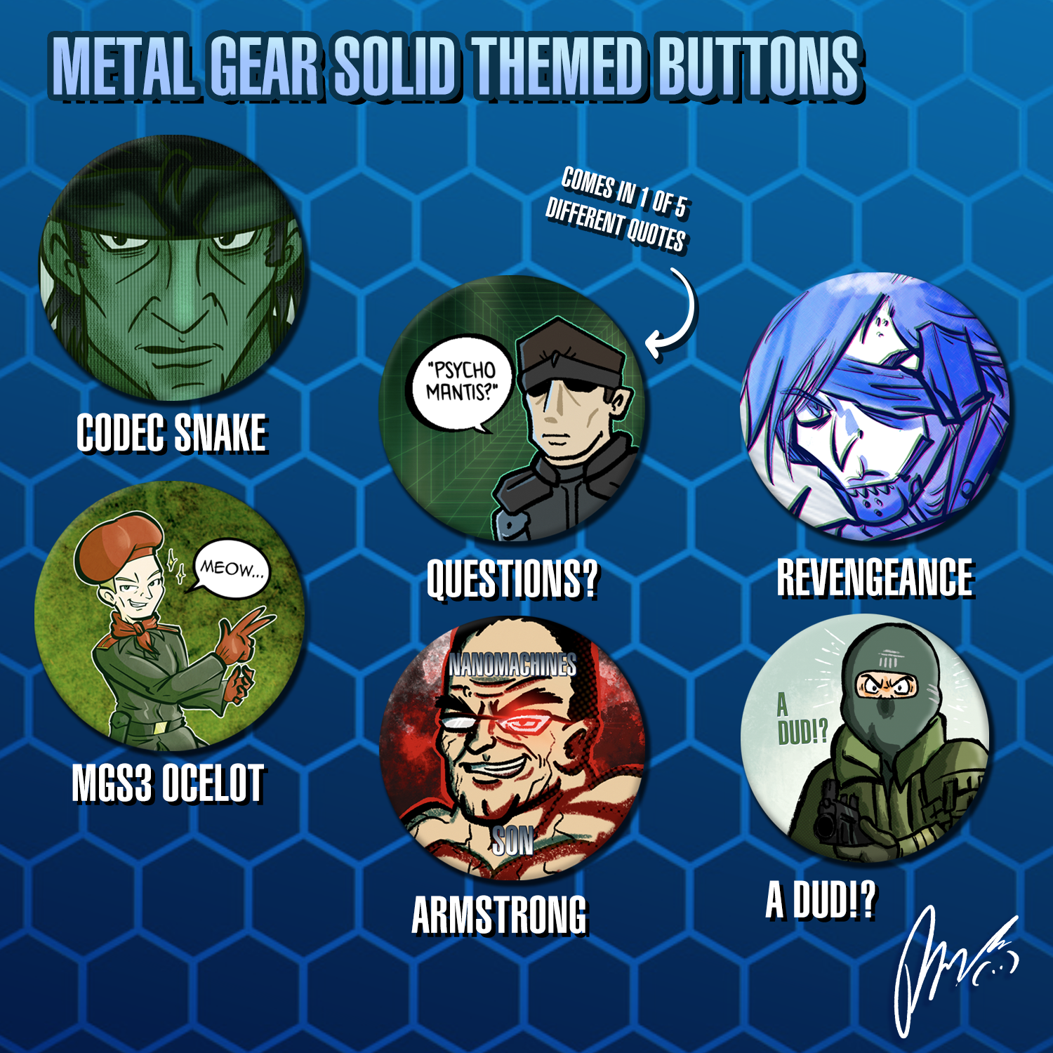 Sneak these 1.5 inch sized MGS themed buttons into you hands!