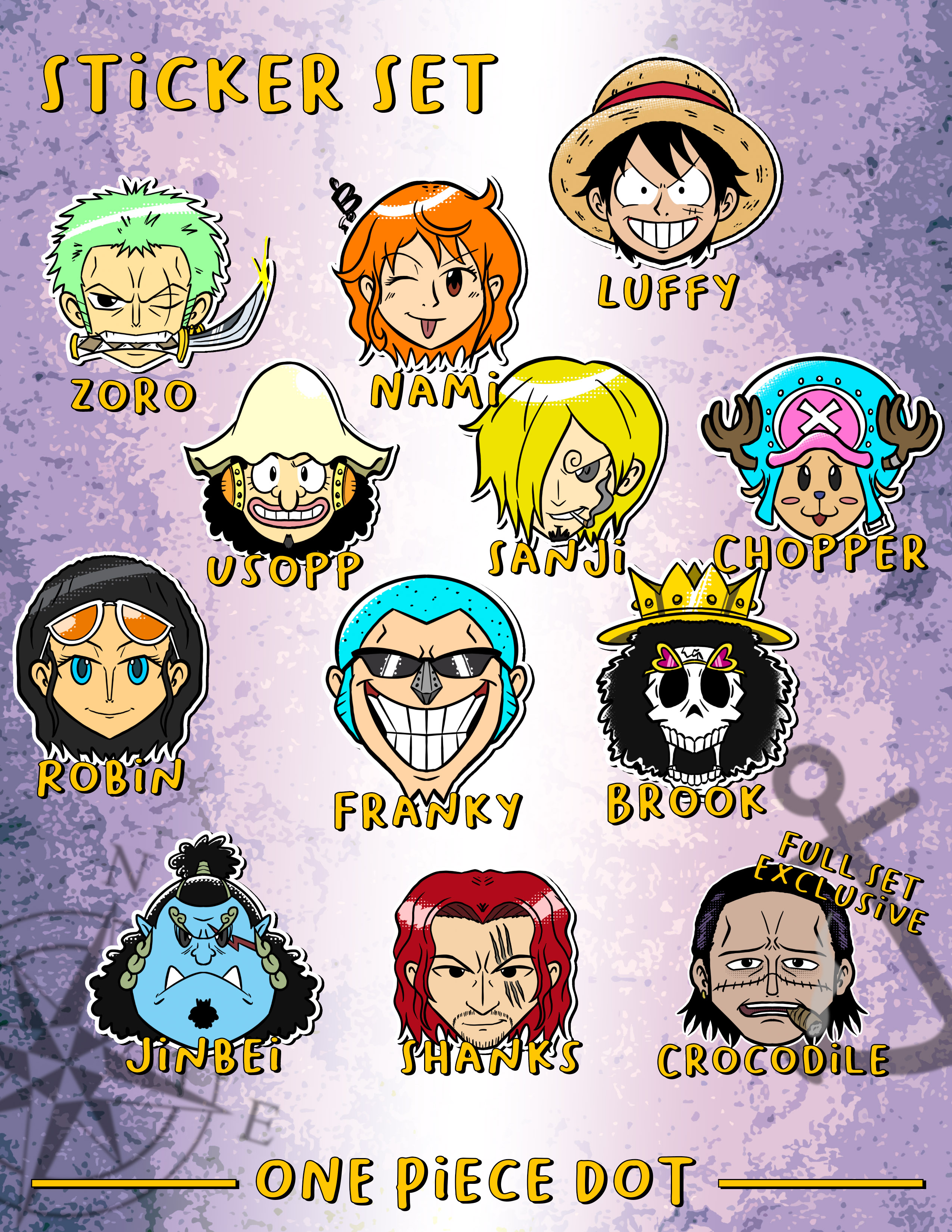 A set of 2.5 inch stickers featuring every current Strawhat Pirate (+Shanks)
