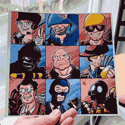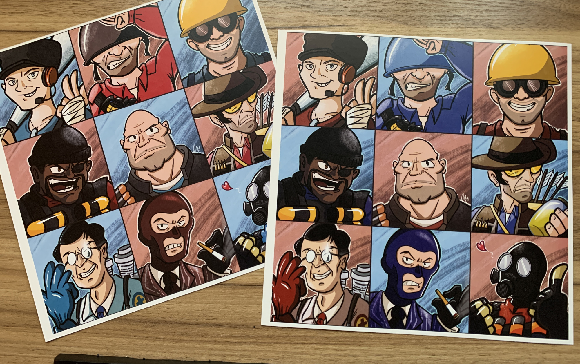 A full 8x8 inch print featuring each merc from TF2. It's also double sided! Flip the print to change their team from RED to BLU.